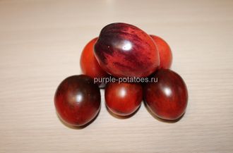 Томат Фиолетовый Дракон выведен американским селекционером Марком МакКаслином из штата Минесота (США). Сорт среднеранний, индетерминантный. Плоды у этого томата овальные со сбегом к макушке, иногда с маленьким носиком, массой 30-60 граммов. В кистях образуется по 6-8 плодов. Плод как лакированная сливка! В молочной спелости черный, дающий оранжевый и красный оттенки в спелости, усыпанный темными полосками и штрихами. Безумно красивый! Вкус отменный!Очень вкусный с явной фруктово-пряной ноткой, сочный, без кислинки. Плоды можно использовать не только для салатов и употребления в свежем виде, но и для консервирования. Плоды оригинально смотрятся в банках. Универсальный, безумно сладкий и красивый томат!