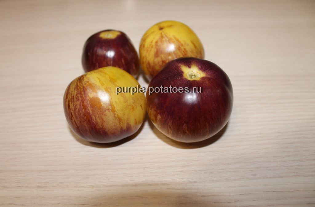 Среднеранний индетерминантный сорт селекции известного американского ученого Тома Вагнера. Плоды у этого сорта круглые, желтой окраски с фиолетовыми плечиками и разбросанными от них полосами. Плоды массой до 150 грамм. Мякоть желтая, сочная, со сладковатым привкусом. Плоды используются в основном для приготовления салатов. Сорт устойчив к болезням, плодоносит до самых заморозков.