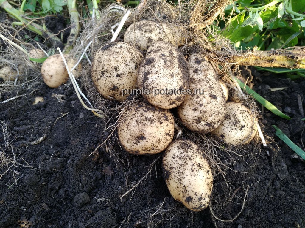 Среднеранний (60-80 дней) столовый сорт. Отличается превосходными вкусовыми качествами, входит в десятку лучших отечественных сортов. Клубни обладают приятным сладковатым вкусом, мякоть без лишней сухости или водянистости, в готовом виде рассыпчатая. Развариваемость клубней средняя, они пригодны для любых блюд, но особенно хороши для жарки и запекания, а также из них получается прекрасное воздушное пюре. Содержание крахмала 12,4−15%. Пригоден к транспортировке на дальние расстояния и длительному хранению. Цветки некрупные, белой окраски, собраны в венчики средних размеров. Корневая система мощная, на одном растении формируется до 15 клубнеплодов массой 73−116, иногда до 150 грамм. Клубни овальной формы, слегка приплюснутые, ровные. Кожура желтого цвета, гладкая на ощупь. Мякоть от белой до светло-кремовой окраски, не склонна к потемнению при варке и резке. Глазки очень мелкие.