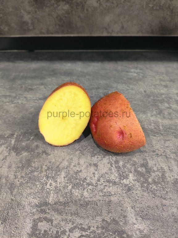 Новый среднеспелый столовый сорт от российских селекционеров. Клубень овальный с мелкими глазками. Кожура красная. Мякоть кремовая. Масса товарного клубня - 95-115 г. Содержание крахмала до 16,9%. Вкус хороший и отличный. Сорт обладает высокой урожайностью. Устойчив к большинству картофельных болезней.