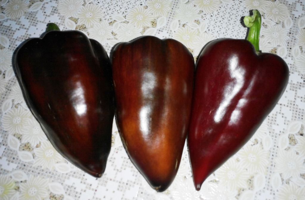 Главное достоинство этого сорта - раннеспелость. От всходов до технической спелости плодов проходит около 90 дней. Куст невысокий 40-45 см. В стеблях и листьях содержится фиолетовый пигмент - антоциан, усиливающий холодостойкость. Плод конусовидный, средней величины, массой 120 грамм. Созревание плодов дружное. Окраска плодов оригинальная - в технической спелости фиолетовая (почти чёрная), в биологической - тёмно-вишнёвая. Плоды очень вкусные, содержащие полезные для здоровья человека антиоксиданты. Посадив этот сорт вы всегда будете с урожаем.